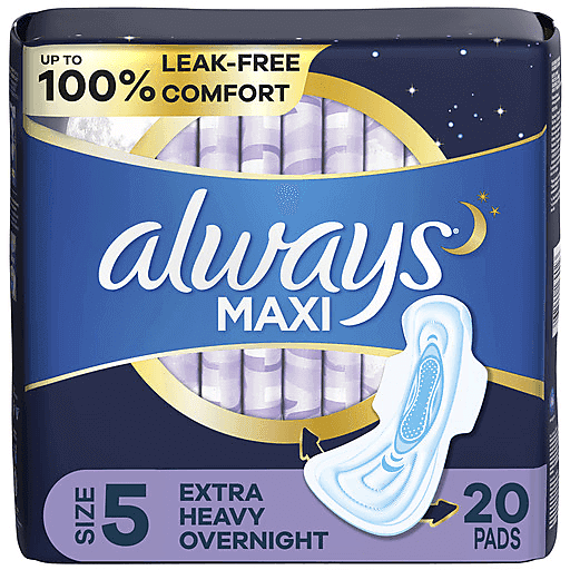 Always Maxi Overnight Pads provide you a PERFECT NIGHT SLEEP with 2X MORE BACK COVERAGE to help stop leaks at night. If you're looking for uncompromised period protection, you've come to the right place. Always Maxi Pads ABSORB 50% MORE vs. same size Always Ultra Thin Pad. Additionally, Always Maxi Pads also feature the Always 3X Protection System to give you up to 100% leak-free comfort, no matter how you sleep. Always Maxi Pads possess RapidDRY Technology, which works to wick away gushes fast to absorb more than you may need. Experience long lasting protection with leakGUARD technology that locks in leaks, and SecurelyFITS helps the pad stay in place throughout no matter what you do. Make sure that you are getting the right protection from your pad, as using the wrong pad size can lead to leaks. Whether you have a heavy flow or a light one, Always has you covered. Always Maxi Pads come in a range of sizes fit your flow and size perfectly depending on your needs. If you have a light flow or need a teen-sized pad, then we would recommend using our Always Maxi Pad size 1 to 3. If you have a heavy flow or want overnight protection, then we recommend using our size 4 or 5 Always Maxi Pad. We've got your flow covered day and night for up to 100% leak-free protection.
