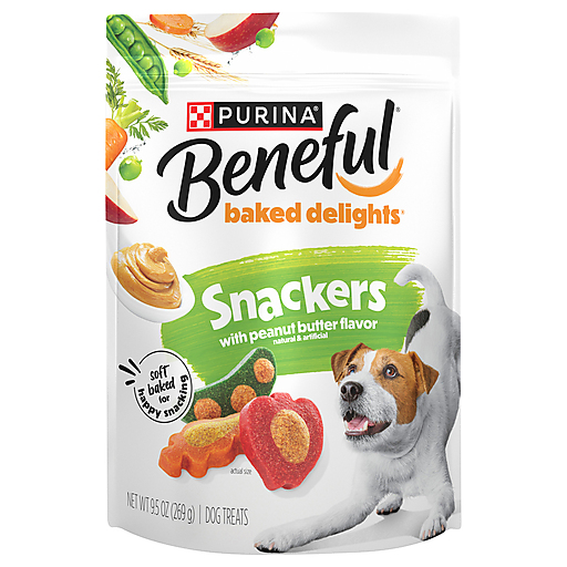 Reward your canine with treats that taste as good as they make him feel with each serving of Purina Beneful Baked Delights Snackers With Peanut Butter Flavor dog snacks. These Purina Snackers pet treats for dogs are oven-baked to give them a crunchy exterior and great taste that's full of love. Savory, soft centers provide a delightful contrast to the crunchy outside. These Snackers doggie treats with peanut butter flavor are made with wholesome grains and accents of apples, carrots and peas for a between-meal snack or well-deserved training treats for dogs you feel good about serving. Purina Beneful Baked Delights Snackers soft treats for dogs are produced in U.S. facilities and undergo regular quality and safety checks for your peace of mind. Let your best buddy know just how much you appreciate his loyal companionship with Purina Beneful Baked Delights Snackers dog snacks.