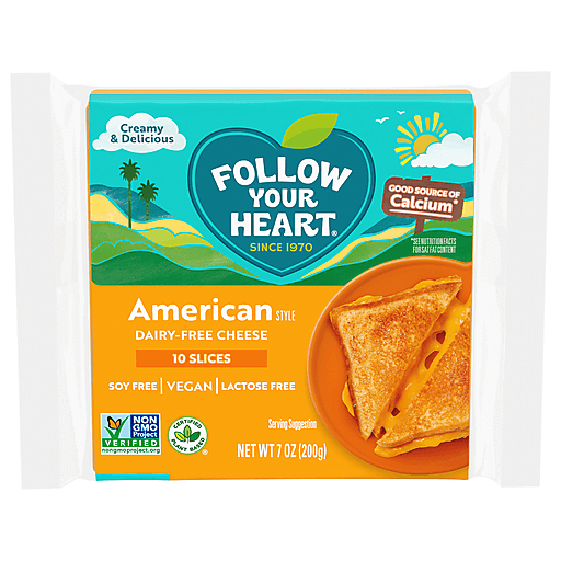 Satisfy your taste buds and feed your soul with new and improved Follow Your Heart American Style Dairy Free Cheese Slices. Follow Your Heart is now better than ever! You can make your classic favorites without compromising on taste with cheesy American tastiness. A plant based cheese made for cheese fans, Follow Your Heart American cheese is an amazingly smooth and delicious vegan cheese with a rich, creamy texture. Every serving of this lactose free cheese alternative is free from dairy, soy, lactose, gluten and artificial flavors. These dairy free cheese slices are also Non GMO Project Verified and certified kosher. These vegan cheese slices melt beautifully with dishes like grilled cheese sandwiches, quesadillas and veggie burgers. Follow Your Heart non dairy cheese tastes great melted or cold and can be added to salads and lactose free nachos, or lay some love on your favorite sandwiches with this amazingly smooth American cheese substitute. Finally, a yummy gluten free, lactose free cheese that melts to perfection! Enjoy every bite of American cheese cheer with Follow Your Heart Vegan Cheese.