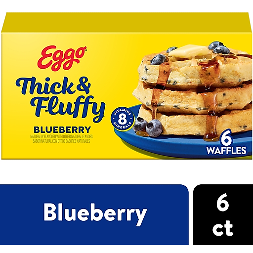 Wake up and greet the day with the feel-good taste of Eggo Thick and Fluffy Blueberry waffles. Crafted with natural flavors and made with no synthetic colors or high fructose corn syrup, our Belgian-style waffles are big on flavor with deep pockets to hold all your favorite toppings. They're the perfect balance of crispy, fluffy goodness. Convenient and easy to prepare, Eggo Thick and Fluffy Blueberry waffles bring warmth to busy mornings. These waffles are baked in the USA and provide a good source of 8 vitamins and minerals per serving. Great for families and individuals, they make a delicious part of breakfast. Eggo waffles are great with your favorite morning toppings like butter and syrup, jellies and preserves, and whipped cream. Thinking of taking a turn for the savory? Combine with bacon or sausage for a tasty waffle sandwich. The scrumptious possibilities are endless. They're just so delicious, why would you L'Eggo your Eggo?