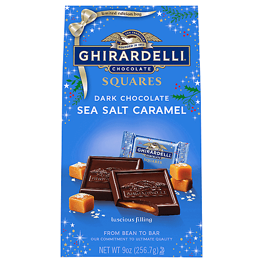 GHIRARDELLI Holiday Dark Chocolate Sea Salt Caramel SQUARES capture the spirit of the season in every bite. Each square features luscious, buttery caramel infused with sea salt and enveloped in rich dark chocolate for a luxurious flavor balance. Perfect for gifting, entertaining, or adding to holiday dessert trays, these individually wrapped chocolates bring elegance and joy to any celebration. Crafted with premium cocoa beans and GHIRARDELLI’s signature smooth texture, they embody quality from bean to bar. Make every festive moment brighter with the indulgent taste of GHIRARDELLI.