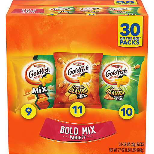 When it comes to snack time, you just can’t beat this cheesy mix! When you’re thinking snacks, dig into the bold flavor of Goldfish Mix Zesty Cheddar, Flavor Blasted Xtra Cheddar and Flavor Blasted Xtra Cheesy Pizza Goldfish crackers. Their irresistible flavor is always baked, and they’re made with real cheese. Talk about a feel-good snack! With this much flavor you can count on big flavor and big fun that always delights. This super-tasty trio is so tasty, it takes crunchable and munchable cheese crackers to a whole new level. It’s even perfect at meal time! You can add Goldfish crackers to soups, sprinkle them on salads, or simply serve as a side to your lunchtime sandwich. This Goldfish variety pack contains 30 single-serving snack packs, keep them in your pantry for any time the mood strikes. Everybody loves Goldfish crackers at mealtime, for after-school snacking and on-the-go in the car. When you’re craving something delicious, go for the handful!