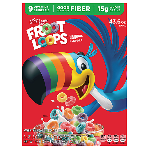 A fun part of a balanced breakfast and bursting with fruity flavor, Kellogg's Froot Loops Breakfast Cereal is a delicious morning treat both kids and adults love. Just as nutritious as it is delicious, Kellogg's Froot Loops Cereal provides a good source of nine vitamins and minerals and is low fat (contains 1.5g total fat per serving). Not just for breakfast, Kellogg's Froot Loops Cereal is a tasty and nutritious addition to any meal or snack any time of the day; Pack a bag for a snack at the office, take as an afternoon pick-me-up, reenergize with a post-workout treat, and indulge in a late-night bowlful of sweet, crunchy breakfast cereal. This cereal also makes a great addition to your favorite yogurt or as the base for a homemade trail mix, the mouthwatering options are endless. Take Kellogg's Froot Loops Cereal with you in a baggie and stow in lunchboxes, backpacks and totes, it's perfect for on-the-go moments. Just add your favorite milk or enjoy as a crispy treat straight from the box.