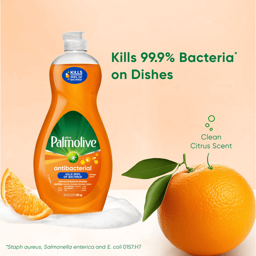 Ultra Palmolive Antibacterial Dish Liquid kills 99.9% of bacteria* on your dishes and kitchen surfaces. Our US EPA registered dish liquid contains a plant-based active ingredient** and cuts grease to leave your dishes clean and residue free *Staph aureus, Salmonella enterica and E. coli 157:H7 **Active ingredient synthesized from plants