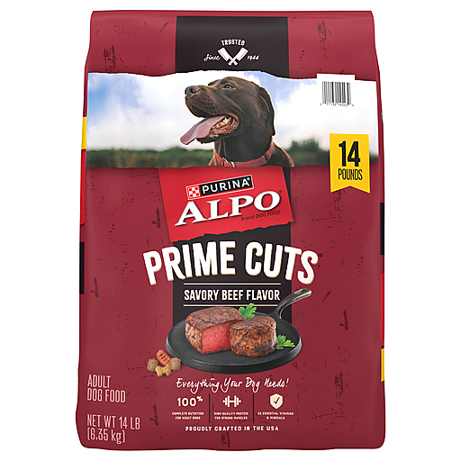Tear open a bag of Purina ALPO Prime Cuts Dry Dog Food Savory Beef Flavor, and just watch as your best friend dives into this adult dog food meal with tail-wagging enthusiasm. Enjoy the satisfaction on his face as he cleans his bowl, crunching into the hearty dog kibble shapes flavored with the meaty Purina dry dog food taste he loves. Rest easy knowing your faithful companion's favorite beef flavor dog food has high-quality protein to help support muscles, as well as 23 essential vitamins and minerals, including calcium to help support strong bones. It also contains linoleic acid for skin and coat health. The crunchy kibble dog food has an appetizing texture your dog will devour bite after bite. Feed him ALPO Prime Cuts Savory Beef Flavor dry dog food daily to make sure he gets the 100 percent complete and balanced nutrition an adult dog requires and see how easy it is to give your dog the tasty, wholesome dog food he loves along with the dependable nourishment you love to give him.