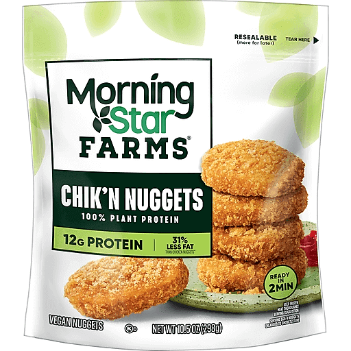 MorningStar Farms chik'n nuggets feature lightly seasoned veggie nuggets with a crisp, crunchy outside and tender inside. With 31% less fat than regular chicken nuggets*, these vegan nuggets provide an good source of protein (12g per serving). Stock this convenient resealable bag in the freezer for an exciting anytime meal starter you can pair with your favorite dips, celery, or serve in a wrap; These nuggets make for a perfect meat alternative to share with friends on special occasions, preparing a meal for the whole family, or just seeking a quick lunch or dinner starter. Dunk them in your favorite sauces for an even more delicious bite. MorningStar Farms chik'n nuggets are a hearty choice that will please vegans, vegetarians, and meat-lovers alike.. *Chicken nuggets contain 13g total fat per serving (86g). Morningstar Farms Chik'n Nuggets contain 9g total fat per serving (86g).