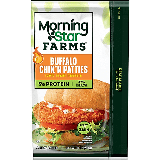 A delicious meat-free meal for any diet, MorningStar Farms Buffalo meatless chicken patties feature a lightly seasoned and spicy, buffalo-style patty with a crispy, crunchy breading outside and tender inside. Ideal for an array of recipes, these vegan patties can become part of a satisfying sandwich, wrap, or even a salad topper. With 37% less fat than regular chicken patties*, these patties provide a good source of protein (9g per serving, 13% daily value); Stock this convenient resealable bag in the freezer for an exciting anytime meal you can easily prepare in an oven or microwave. Whether you're putting together a winning spread for game night, preparing a meal to share with the whole family, or just seeking a quick lunch or dinner, MorningStar Farms Buffalo chik'n patties are a delicious choice sure to please meat-lovers and vegetarians alike. *Chicken patties contain 14g total fat per serving (71g). MorningStar Farms Buffalo chik'n patties contain 9g total fat per serving (71g).