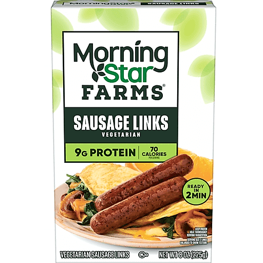 MorningStar Farms veggie sausage links are a vegetarian meat alternative seasoned with an inviting blend of aromatic spices to delight everyone in your family. With 85% less fat than cooked pork sausage*, MorningStar Farms meatless sausage links contain 9g of protein (12% of daily value) and are made with high quality ingredients; Whether you're whipping up a breakfast scramble, a short stack of pancakes, or biscuits with veggie gravy, MorningStar Farms veggie sausage links are sure to please vegetarians and meat-lovers alike. They make a wonderful addition to breakfast tacos, too. Dip them in your favorite syrup for a sweet bite. Simply add your favorite breakfast sides and toppings and enjoy a vegetarian meal with all the flavors you love. MorningStar Farms makes it so easy to enjoy a delicious vegetarian breakfast any time of the day. *Cooked pork sausage links contain 19g total fat per serving (45g). MorningStar Farms Sausage Links contain 3g total fat per serving (45g).
