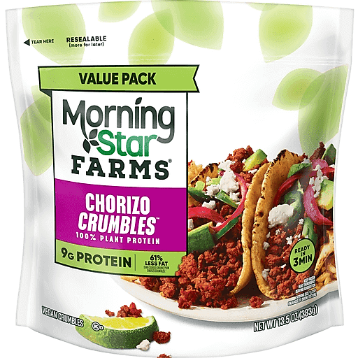MorningStar Farms Chorizo crumbles are a meatless favorite that make busy weeknight meals easy. They're boldly seasoned and perfect for a variety of savory recipes. Go ahead and get creative! Use these pre-seasoned vegan crumbles for breakfast burritos, stuffed peppers, on a home-made pizza, or as part of a delicious pasta dish; MorningStar Farms vegan crumbles are a good source of fiber (contain 6g total fat per serving), protein (17% of daily value) and are cholesterol free (contains 1.5g monounsaturated fat and 3g polyunsaturated fat per serving). Stock this convenient resealable bag in the freezer for an exciting anytime meal starter you can easily prepare in a skillet or microwave. Tasty and versatile, these spicy crumbles are sure to delight vegetarians and meat-lovers alike. Prepare for a work lunch or use as an easy meal prep ingredient. No extra seasoning needed! For a quick lunch or dinner, anytime is a great time for the delicious taste of MorningStar Farms Chorizo vegan crumbles.