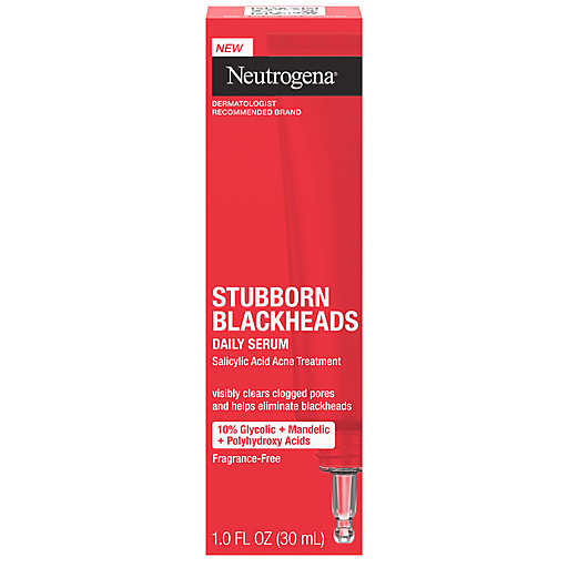 Help clarify your complexion with Neutrogena Stubborn Blackheads Daily Acne Facial Serum. Designed for oily, acne-prone skin, this oil-free face serum from a dermatologist-recommended brand visibly clears clogged pores to help eliminate stubborn breakouts & blackheads. Powered by a dermatologist-grade acid complex, the blackhead remover serum contains 5% glycolic acid, which exfoliates to help remove pore-clogging dirt, oil, & bacteria that can cause acne. Other exfoliants--2.5% mandelic acid & 2.5% polyhydroxy acid—are included in our formula with salicylic acid to help prevent & clear up breakouts. A perfect addition to your acne prevention daily skincare routine, this facial serum is fragrance-free, paraben-free, oil-free, phthalate-free, dye-free, & sulfate-free. The lightweight blackhead serum is suitable for all skin tones, & should be layered under moisturizer or makeup. After cleansing, apply a thin layer of the salicylic acid serum to affected areas up to three times per day.