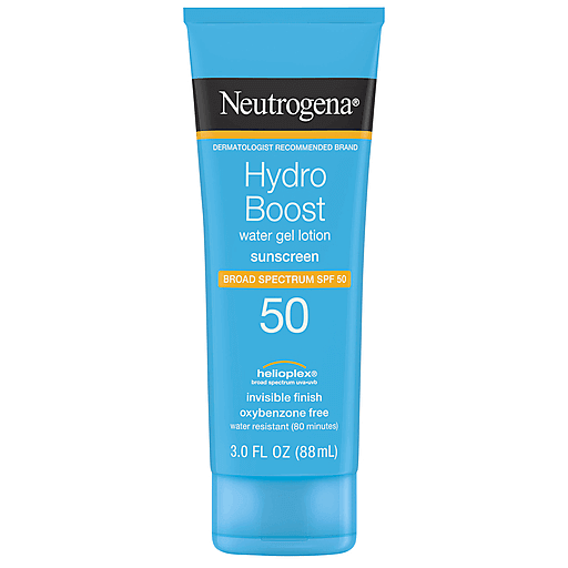 Add SPF to your new skincare routine. Neutrogena Hydro Boost Water Gel Moisturizing Sunscreen Lotion with Broad Spectrum SPF 50 delivers superior broad spectrum UVA/UVB protection and hydration with a water-light, refreshing feel. This water-resistant sunscreen lotion for face & body leaves skin looking healthy and moisturized for up to eight hours without any greasy residue or white marks. The non-greasy SPF 50 sunscreen has a light, clean feel and layers invisibly under makeup. Neutrogena Hydro Boost Water Gel Lotion Sunscreen with Broad Spectrum SPF 50 is also oil-free, and non-comedogenic, which means it won't clog pores. When used as directed with other sun protection measures, the water gel sunscreen may decrease the risk of skin cancer and early aging caused by the sun. From the #1 dermatologist recommended suncare brand. New formula contains no oxybenzone and uses avobenzone for optimal protection from UVA & UVB rays.