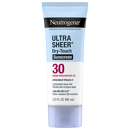 Neutrogena Ultra Sheer Dry-Touch Sunscreen with Broad Spectrum SPF 30 travel size sunscreen provides powerful sun protection that you will love to wear without the heavy finish. Featuring Avobenzone, Homosalate, Octisalate, Octocrylene as active ingredients, this non-greasy body sunscreen is oxybenzone free, Hawaii Act 104 compliant. With Helioplex technology to provide superior UVA/UVB protection from aging UVA rays and burning UVB rays. Enriched with antioxidant vitamin E, the lightweight SPF sun screen lotion with Dry-Touch technology absorbs fast for a clean, ultra-light feel and non-shiny finish. Lotion sunscreen formula is non-comedogenic and PABA-free. This Neutrogena sunscreen is water-resistant for up to 80 minutes and comes from a dermatologist recommended sun care brand. Apply prior to sun exposure to keep skin protected during outdoor activities like gardening, biking, hiking, boating or walking. Protect yourself as you get your daily dose of sunshine.