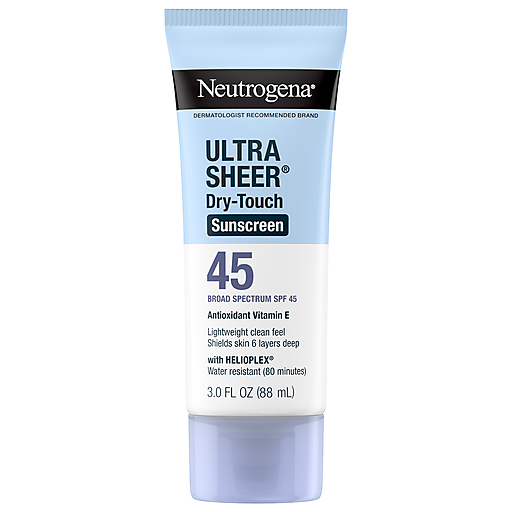 Neutrogena Ultra Sheer Dry-Touch Sunscreen with Broad Spectrum SPF 45 travel size sunscreen provides powerful sun protection that you will love to wear without the heavy finish. Featuring Avobenzone, Homosalate, Octisalate, Octocrylene as active ingredients, this non-greasy body sunscreen is oxybenzone free, Hawaii Act 104 compliant. With Helioplex technology to provide superior UVA/UVB protection from aging UVA rays and burning UVB rays. Enriched with antioxidant vitamin E, the lightweight SPF sun screen lotion with Dry-Touch technology absorbs fast for a clean, ultra-light feel and non-shiny finish. Lotion sunscreen formula is non-comedogenic and PABA-free. This Neutrogena sunscreen is water-resistant for up to 80 minutes and comes from a dermatologist recommended sun care brand. Apply prior to sun exposure to keep skin protected during outdoor activities like gardening, biking, hiking, boating or walking. Protect yourself as you get your daily dose of sunshine.