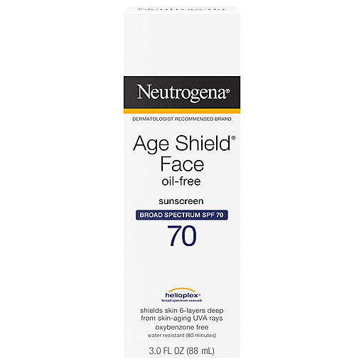 Help keep your skin protected from damaging UV rays with Neutrogena Age Shield Oil-Free Face Lotion Sunscreen with Broad Spectrum SPF 70. Formulated with Helioplex, a sunscreen technology, the Broad Spectrum facial sunscreen shields skin six-layers deep from the sun's damaging rays. Our sunscreen screens burning UVB rays and helps stop aging UVA rays from penetrating surface layers for deep cellular protection. This dermatologist-tested moisturizing sunscreen also contains skin conditioners to hydrate and replenish skin. When used as directed with other sun protection measures, our SPF 70 face sunscreen can help decrease the risk of skin cancer and early skin aging caused by the sun. From the #1 dermatologist-recommended suncare brand, its unique formula is PABA- and oil-free as well as non-comedogenic so it won't clog pores. New formula contains no oxybenzone and uses avobenzone for optimal protection from UVA & UVB rays.