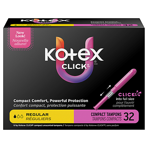Get up to 100% leak-free protection and stay confident throughout your day with U by Kotex Click Compact Tampons! Made without fragrance, Click tampons for women are designed for your comfort and have a smooth tip for easy and comfortable insertion. Each tampon features ComfortFlex grooves that move with y ou for outstanding comfort. Try U by Kotex Click Tampons and see why the #1 compact tampon* is chosen by women every 1.9 seconds. Pocket-sized and small enough to carry in your purse or pocket, these tampons go from compact to a full-size tampon in one easy step giving you comfortably compact, powerful protection. Pull the lower half of the tampon and when it locks in place, it’s ready to go! U by Kotex Click Compact Tampons are available in regular, super and super plus absorbencies. For backup period protection, try U by Kotex Barely There Pantiliners. U by Kotex feminine products are FSA/HSA/HRA-eligible in the U.S. Packaging may vary from images shown.*Based on sales data**Among those with a preference